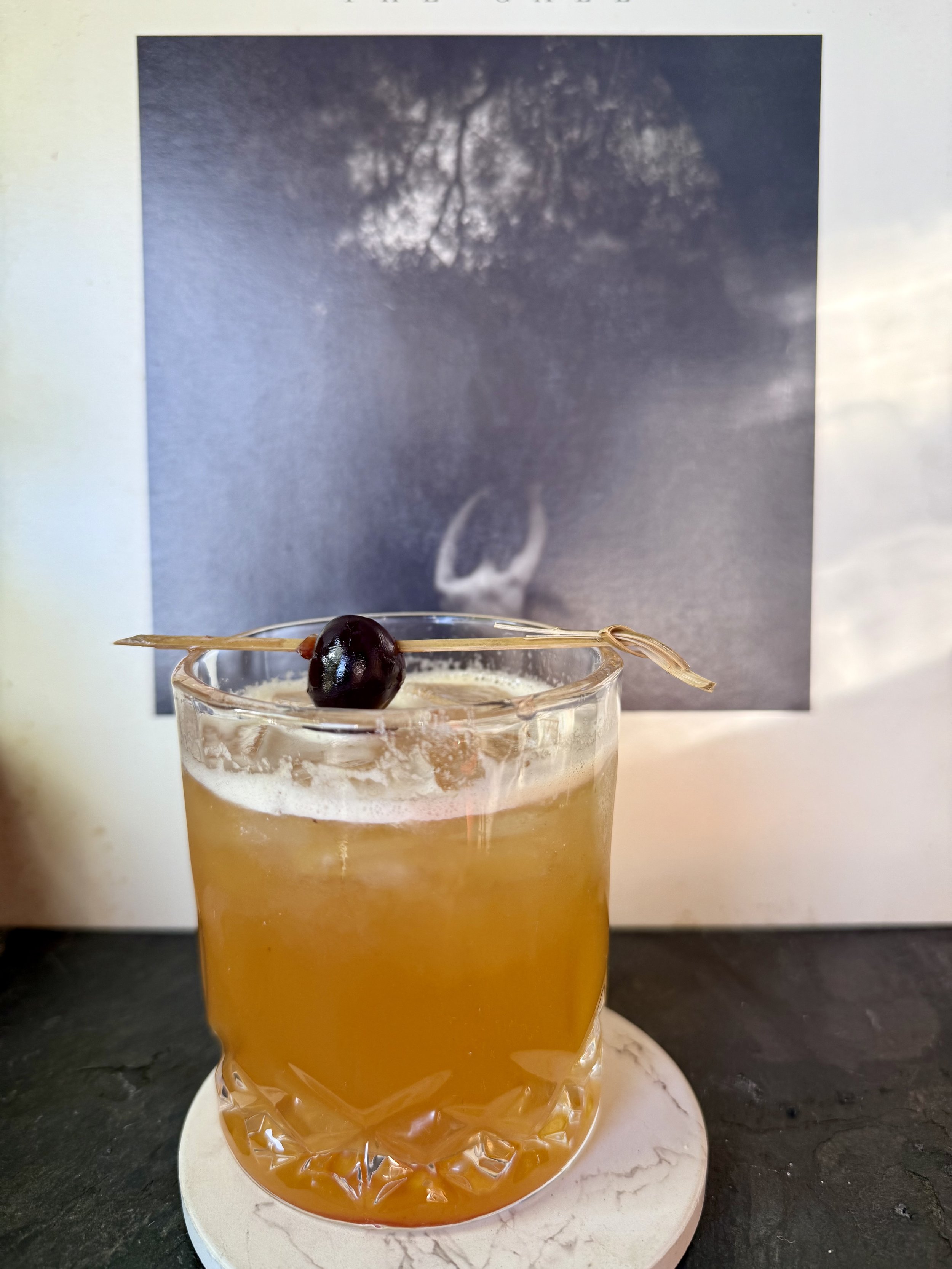 House made Butter Infused Green River Bourbon, Cinnamon Simple, Lemon Juice, Amaretto, Egg White Garnished with Fabbri Italian Cherry. [14]